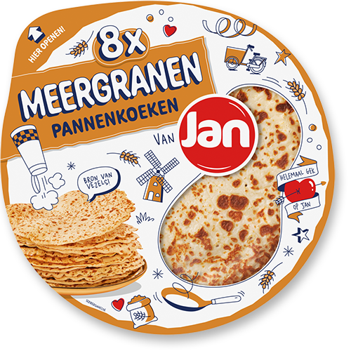 Acht meergranenpannenkoeken, lekker met poedersuiker en stroop of juist hartig met kaas of spek. Dankzij de meergranen zijn ze niet alleen voedzaam, maar ook extra smaakvol! Even opwarmen in de koekenpan, flippen, en klaar – of snel in de magnetron, en genieten maar! Want vrolijke gezichten aan tafel, daar worden we blij van! Daarom bakt Jan zijn pannenkoeken op ambachtelijke wijze, precies zoals zijn moeder dat deed.