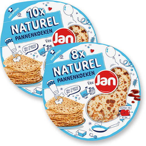 De pannenkoeken van Jan, lekker met poedersuiker en stroop of juist hartig met kaas of spek. Even opwarmen in de koekenpan, flippen, en klaar – of snel in de magnetron, en genieten maar! Want vrolijke gezichten aan tafel, daar worden we blij van! Daarom bakt Jan zijn pannenkoeken op ambachtelijke wijze, precies zoals zijn moeder dat deed.