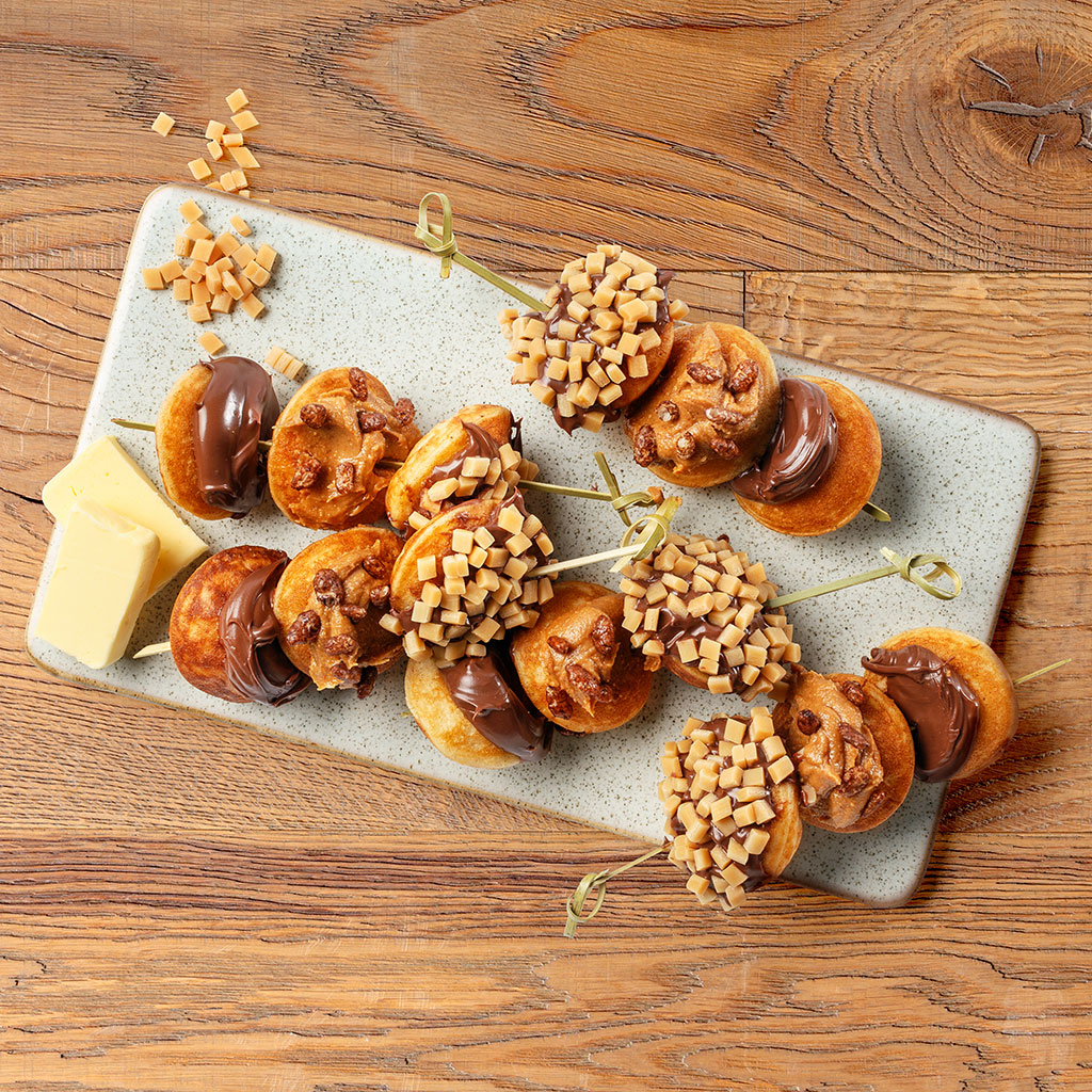 - Rijg vervolgens de poffertjes aan een grote satéprikker. Hierbij doe je steeds 1 pindakaaspoffertje, 1 chocopasta-karamelpoffertje en 1 chocopastapoffertje.